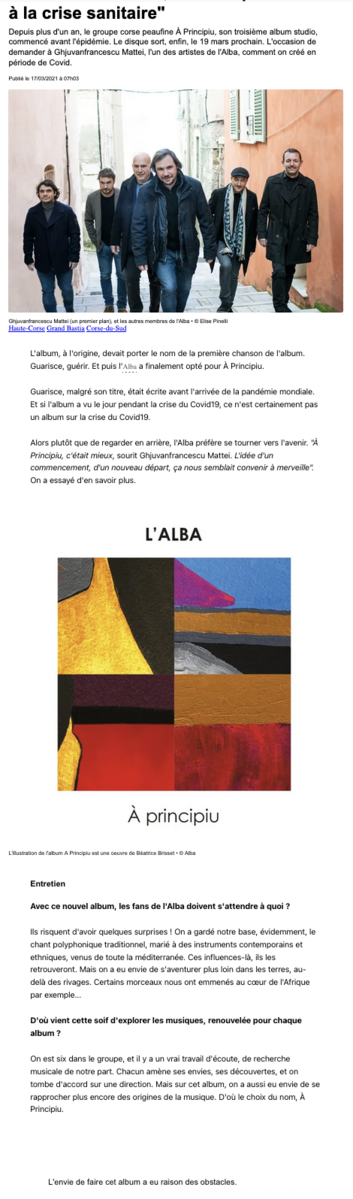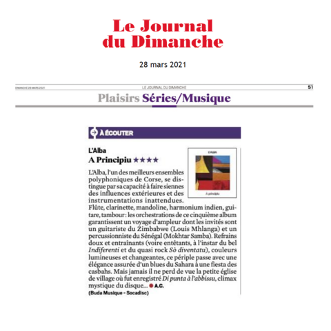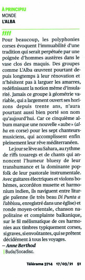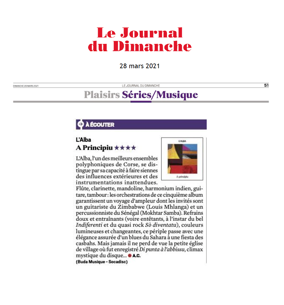 11 octobre Fira Medittèrania Manresa / 14 septembre 21e Festival Skrzyżowanie Kultur / 11 septembre Scontri Figaresi / 26 juillet à Monte – Eglise Saint-Sauveur / 13 juin Festival L’Aria di A Sarra / 17 mai festival itinérant de la Castagniccia-Casinca / 1 mars à Calvi Salle de spectacles / 14 janvier à Paris (75), Studio de l’Ermitage